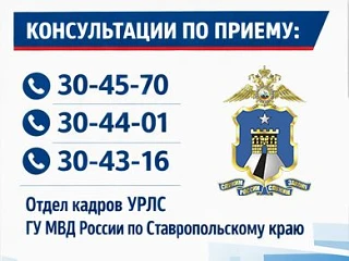 Информацию о наличии вакантных должностей и преимуществах службы можно получить в Отделе кадров УРЛС ГУ МВД России по Ставропольскому краю по телефонам: 30-45-70, 30-44-01, 30-43-16 либо обратившись в подразделение по работе с личным составом территориального органа МВД России на районном уровне.