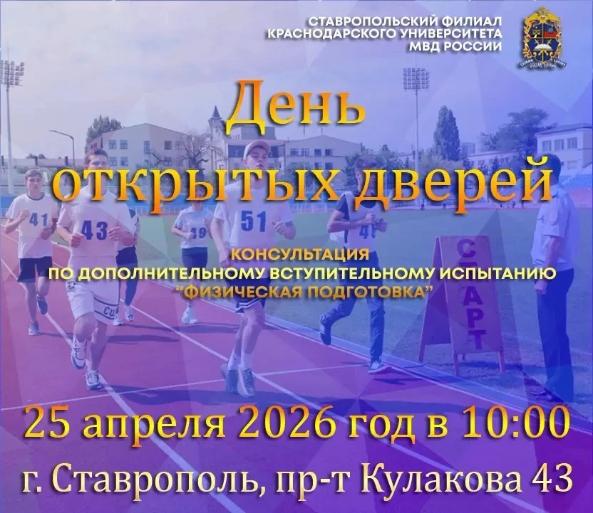 25 апреля 2026 года в 10:00 в Ставропольском филиале Краснодарского университета МВД России состоится День открытых дверей и пройдет консультация по дополнительному вступительному испытанию «Физическая подготовка».