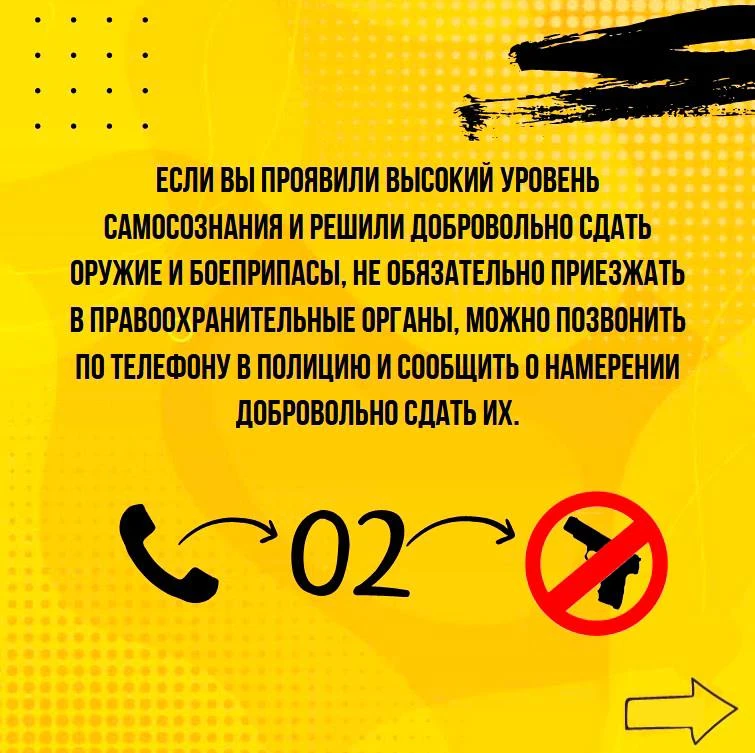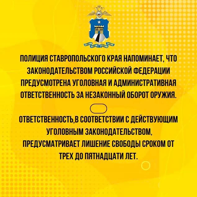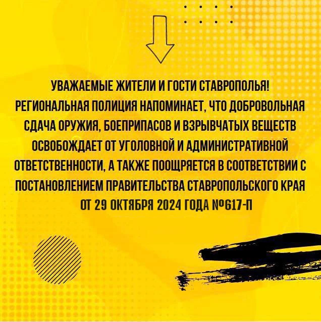 Главное управление МВД России по Ставропольскому краю напоминает, что граждане, добровольно сдавшие незаконно хранящиеся оружие, боеприпасы или взрывчатые вещества, не только освобождаются от уголовной и административной ответственности, но и могут получить денежное вознаграждение в соответствии с постановлением Правительства Ставропольского края от 29 октября 2024 года № 617-п.