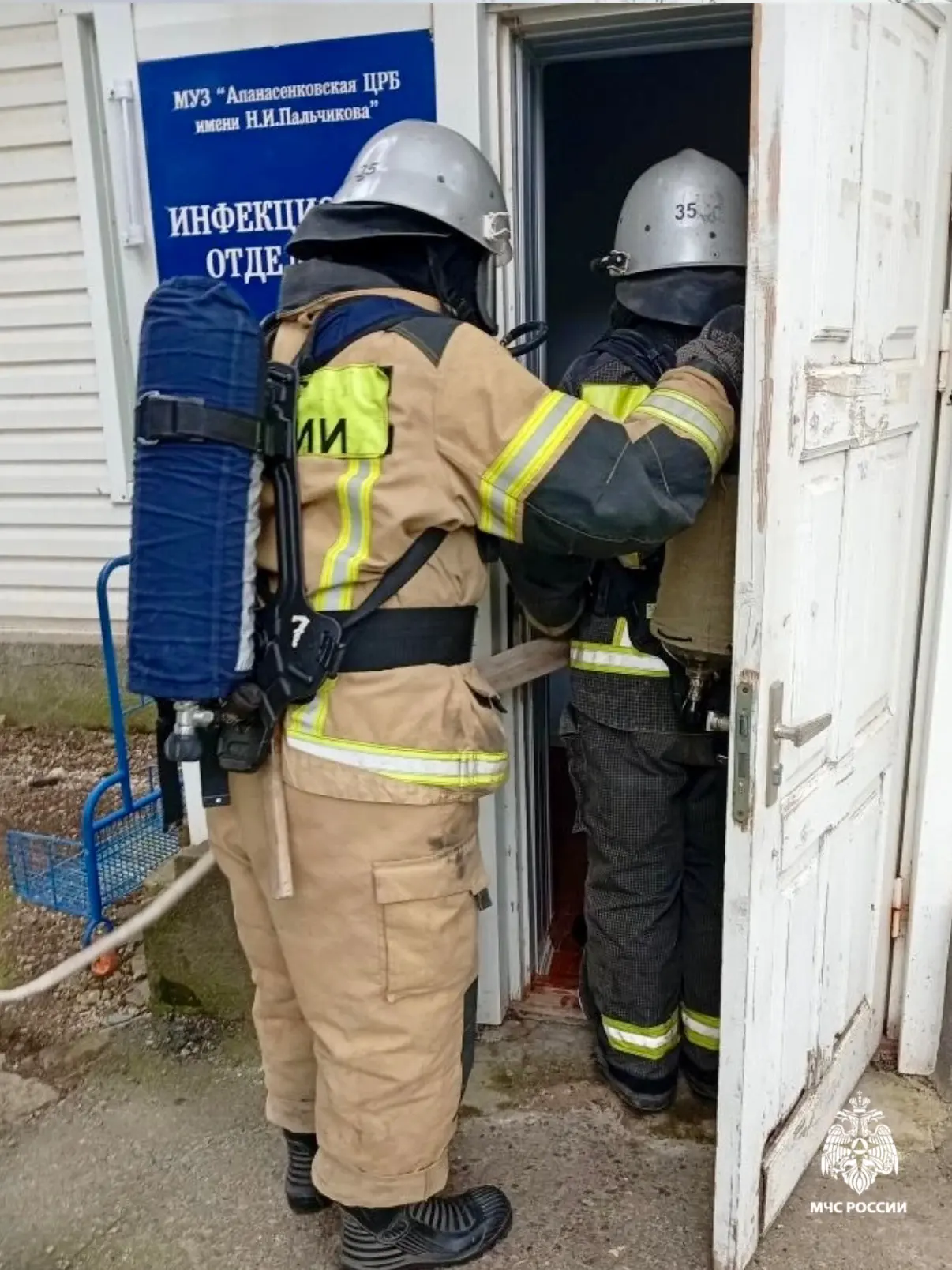 В селе Дивное сотрудники 35-й пожарно-спасательной части МЧС Ставрополья совместно с добровольной пожарной дружиной отработали алгоритм действий при возникновении чрезвычайной ситуации на базе «Апанасенковской районной больницы им. Н.И. Пальчикова».