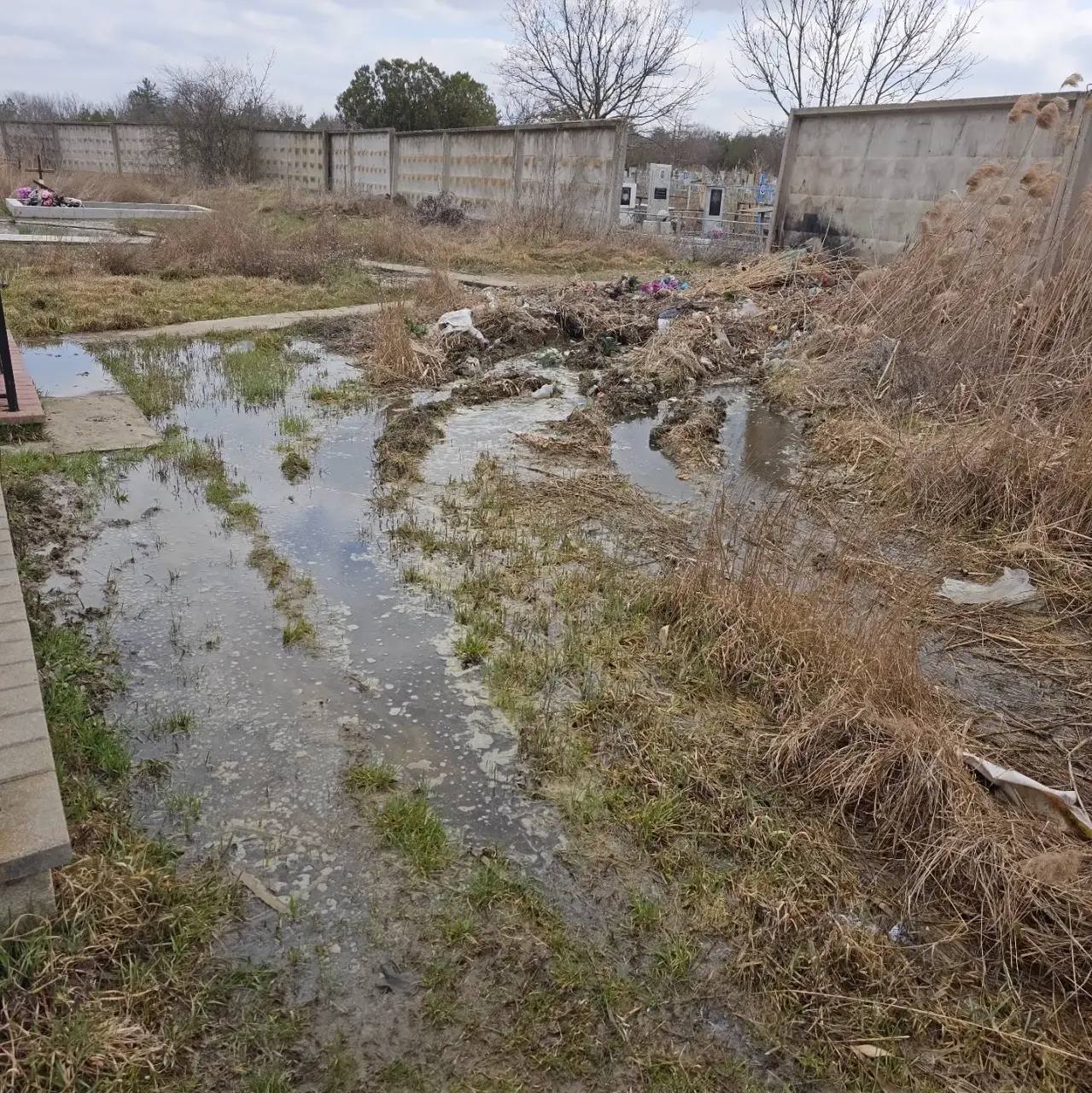 Люди предполагают, что вода идет со стороны трассы, а всему виной отсутствие нормальной канализации или дренажной системы на этом участке. Проблема при этом не новая – от потопов кладбище страдает не первый год. Но сейчас она особенно ощутима: в предпасхальные недели многие хотят привести в порядок могилы родственников, только из-за воды подойти к ним очень сложно.