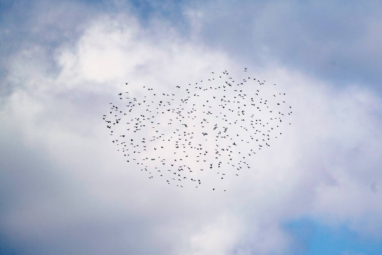 Скворцы собрались в стаю в форме сердца над озером Вшивым
