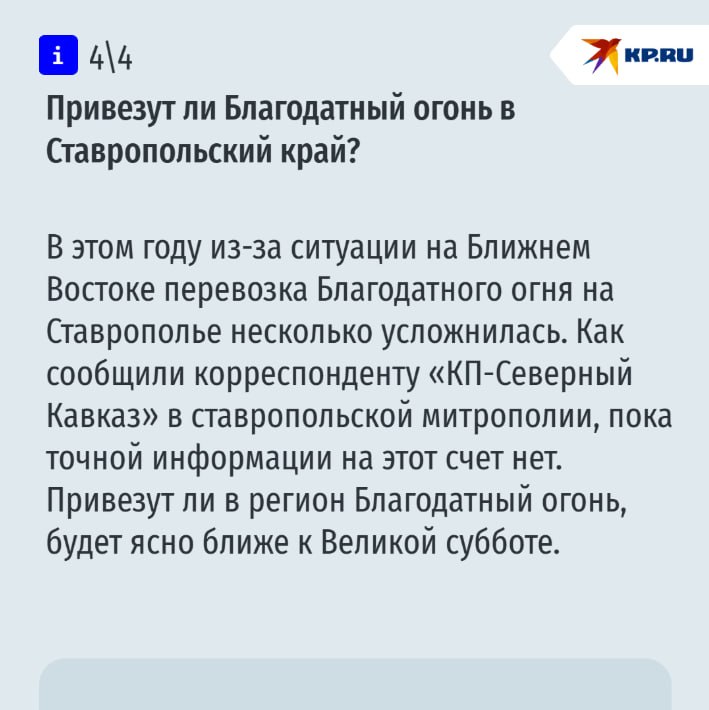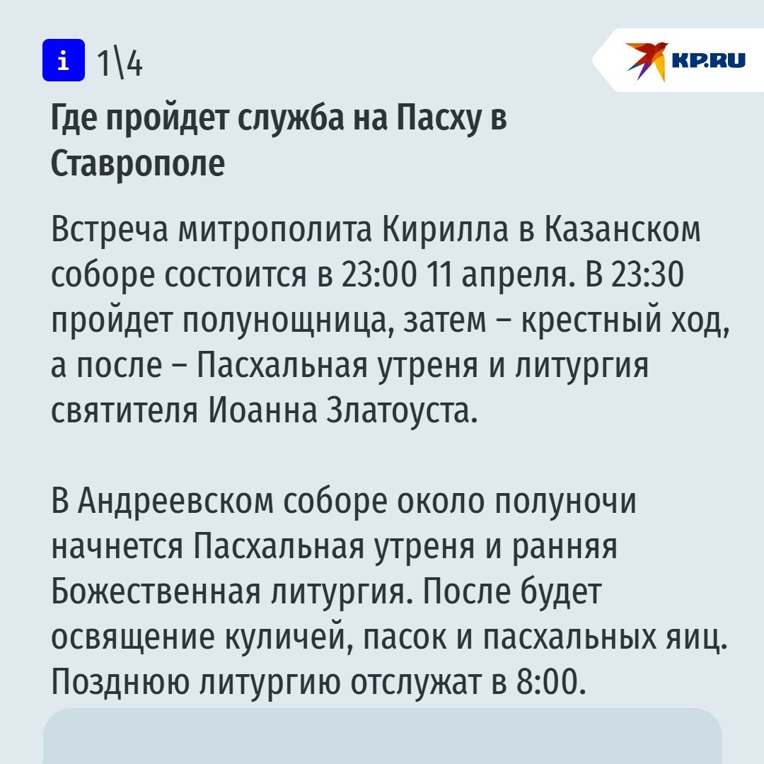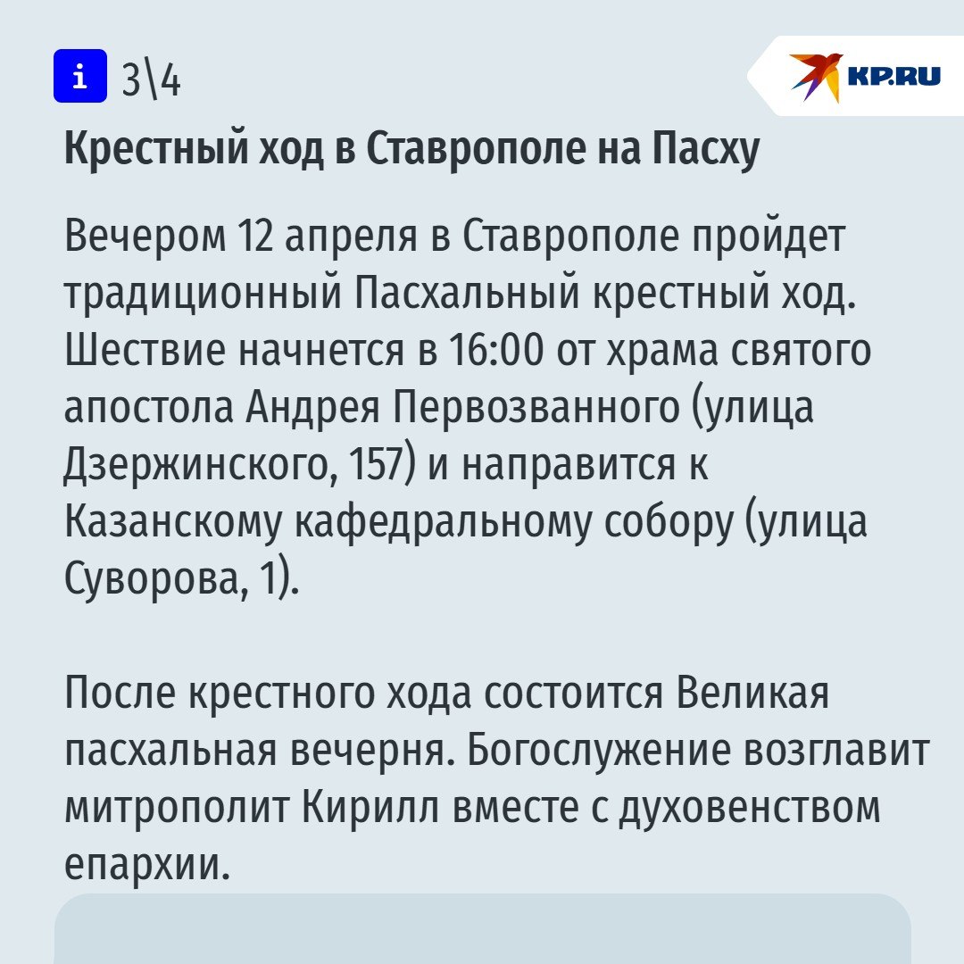 Напомним, главный православный праздник – Светлое Христово Воскресенье, верующие будут отмечать 12 апреля. Традиционно в ночь с 11 на 12 митрополит Ставропольский и Невинномысский Кирилл проведет Пасхальное богослужение в Казанском кафедральном соборе Ставрополя.
