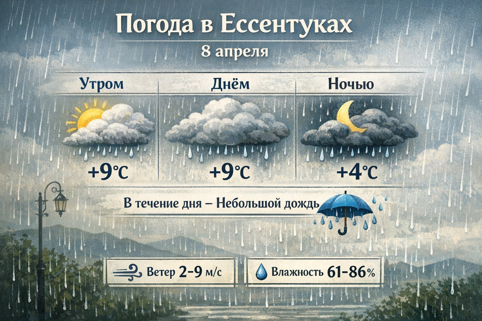 Ветер западный 6-11 м/с, порывы 15-20 м/с. В среду, 8 апреля, температура воздуха по краю ночью -3...+5°, днём +8...+13°.В Ставрополе небольшой дождь, днём +8...+10°.