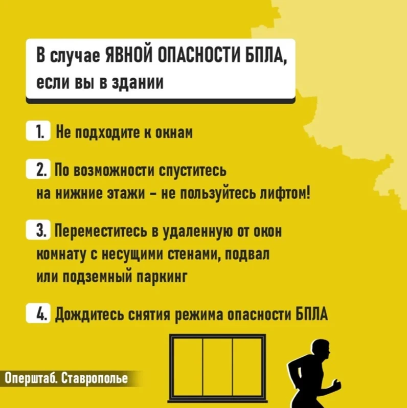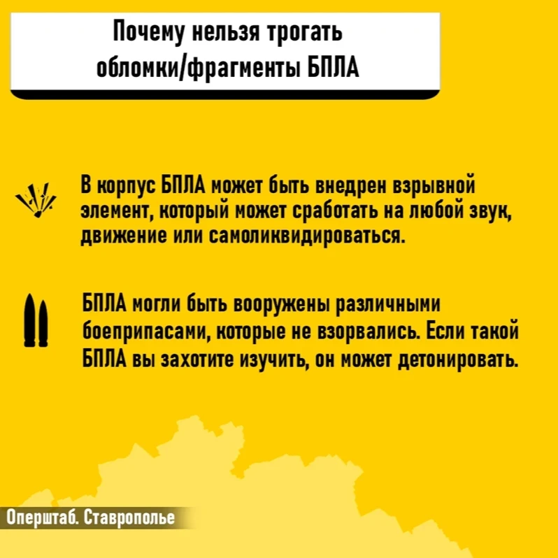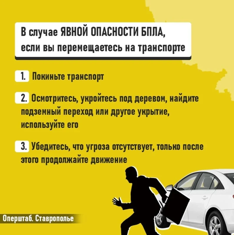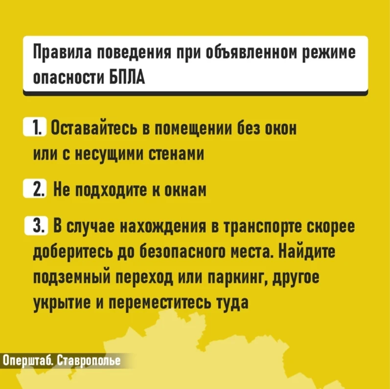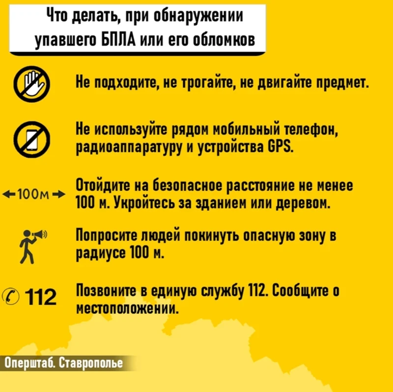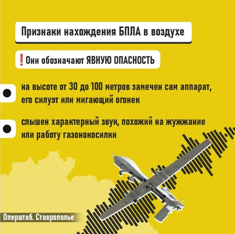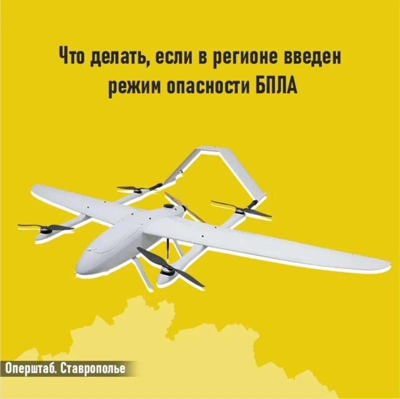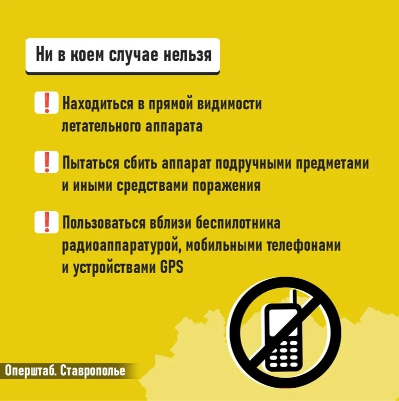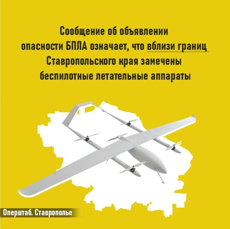 Если вы получили такое сообщение, значит БПЛА приблизились к границам Ставропольского края. Важно незамедлительно переместиться в безопасное место.
