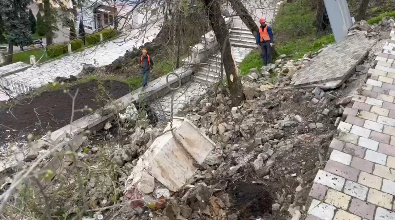 «Проводим работы по очистке склона от упавших элементов ограждения и частей тротуара. Также демонтируем небезопасные участки тротуара», — рассказал мэр.