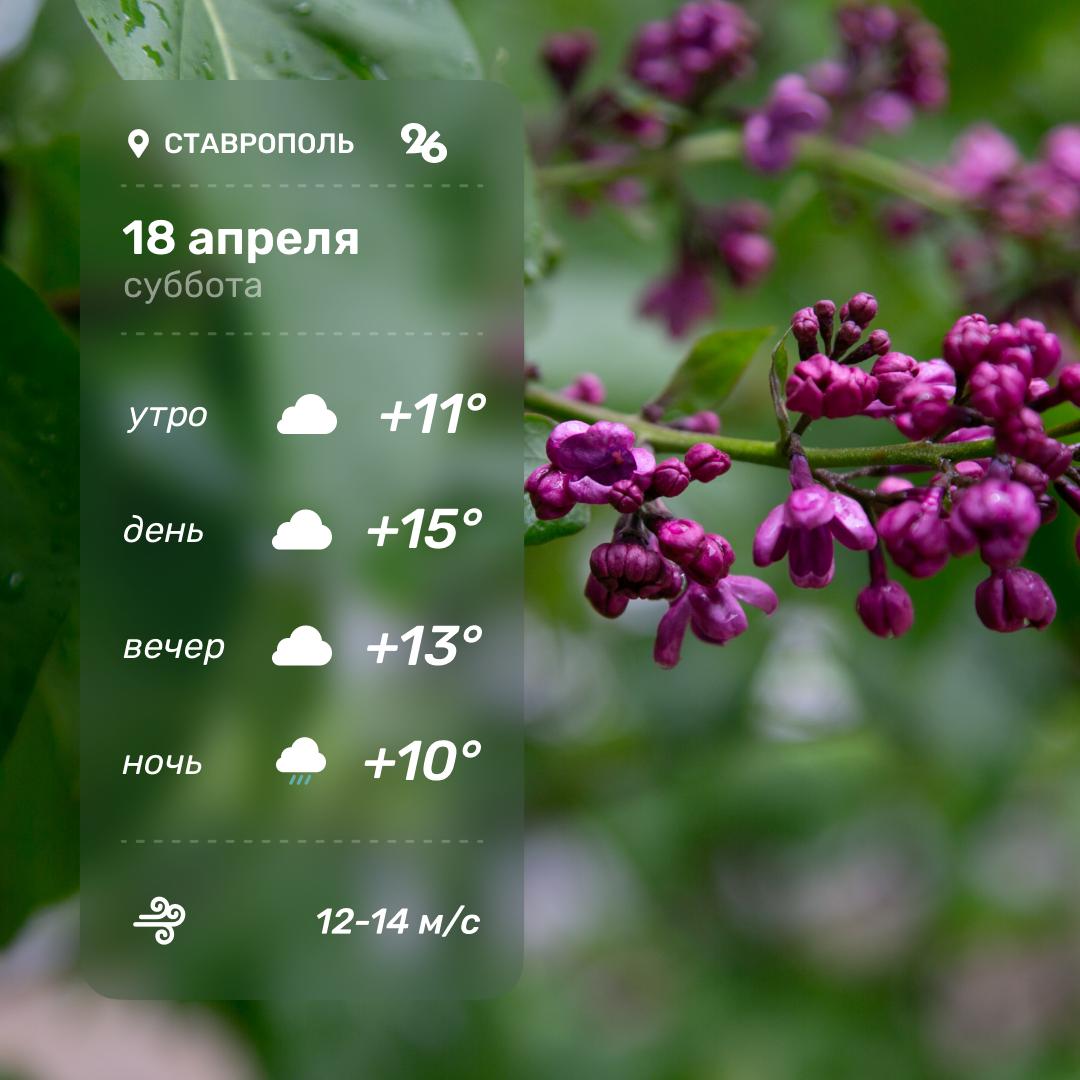 Ветер восточный 6-11 м/с, порывы 12-14 м/с/ В субботу, 18 апреля, температура воздуха по краю ночью +3...+8°, днём +15...+20°.В Ставрополе без существенных осадков, днём +15...+17°.