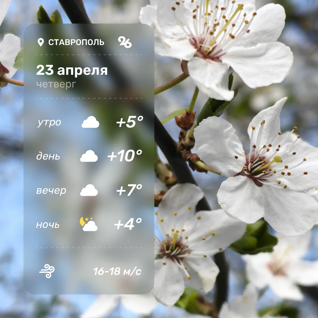 Ветер западный 6-11, порывы 15-18 м/с. В четверг, 23 апреля, температура воздуха по краю ночью -3...+5°, днём +8...+13°.В Ставрополе небольшой дождь, днём +9...+11°.