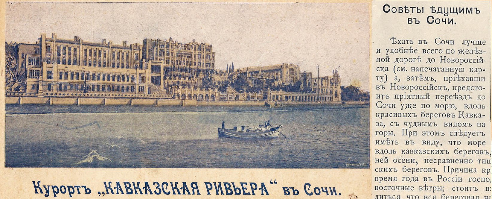 Однако потребовалось еще почти 100 лет для того, чтобы российская публика открыла для себя новое уникальное курортное место - город Сочи. В коллекции "Маленьких историй" есть уникальный экспонат - один из первых рекламных буклетов сочинского курорта "Кавказская ривьера", в котором, помимо прочего, авторам пришлось объяснять читателям, что такое Сочи и где расположен этот город. https://little-histories.org/ne-huzhe-niccy-i-luchshe-chem-v-krymu/