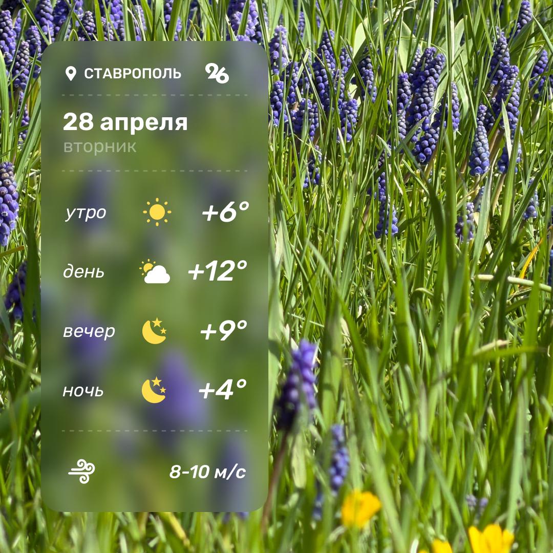 Ветер западный 5-10 м/с. Во вторник, 28 апреля, температура воздуха по краю ночью -3...+5°, днём +11...+16°.В Ставрополе без существенных осадков, днём +12...+14°.