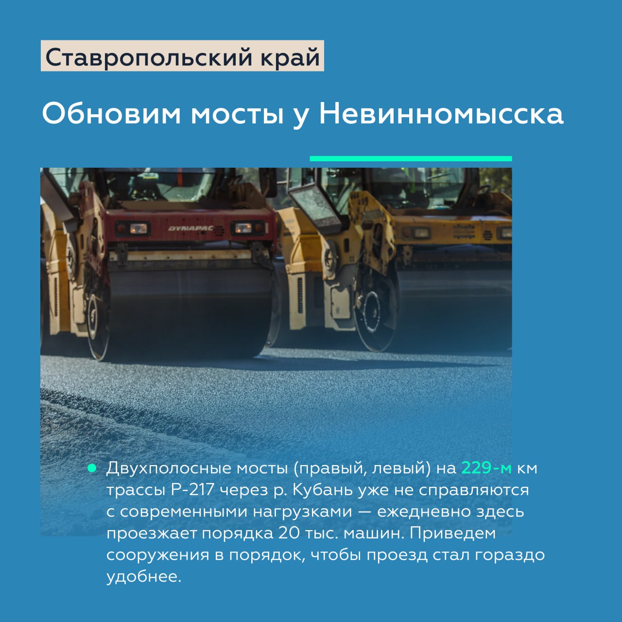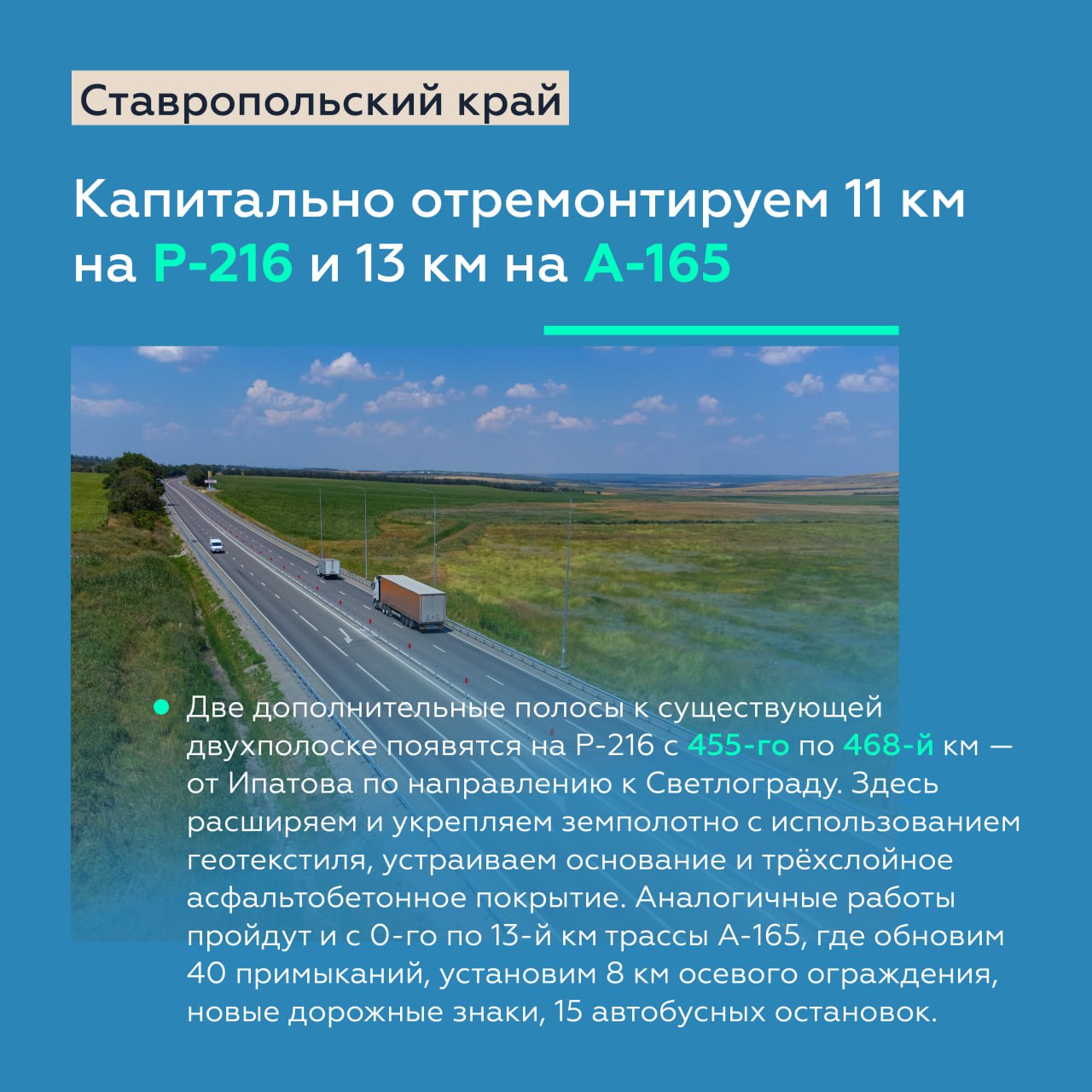 Активные работы идут на подъезде к Ставрополю в составе Р-217 «Кавказ». До конца этого года планируем завершить их с 43-го по 55-й км, а до конца 2027 года — с 20-го по 30-й км.