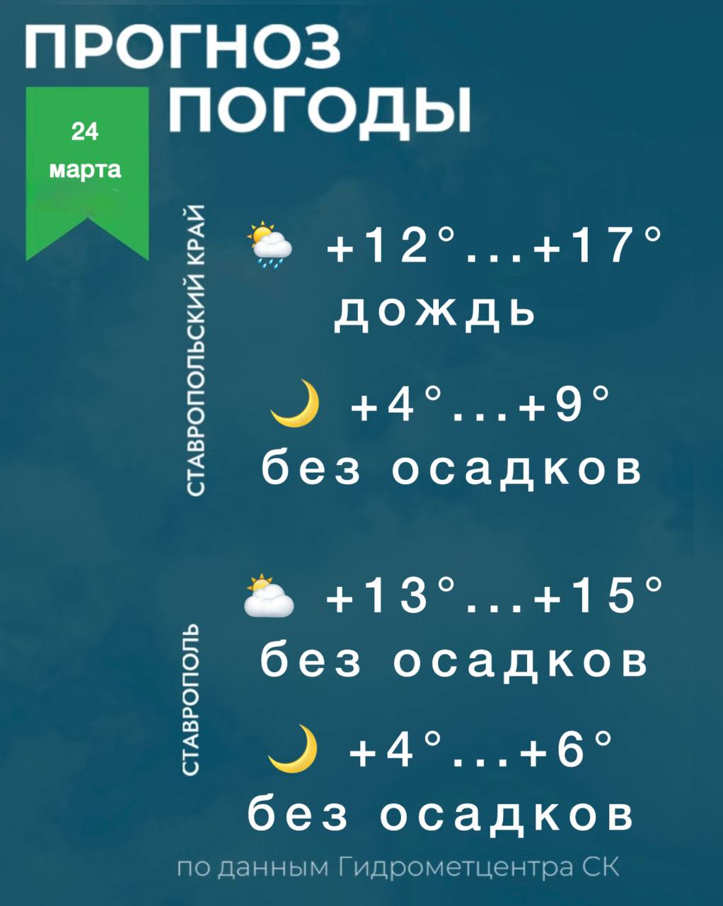Ветер восточный 6-11 м/с, порывы 12-14 м/с. В понедельник, 23 марта, температура воздуха по краю ночью +2...+7°, днём +10...+15°.В Ставрополе небольшой дождь, утром туман...
