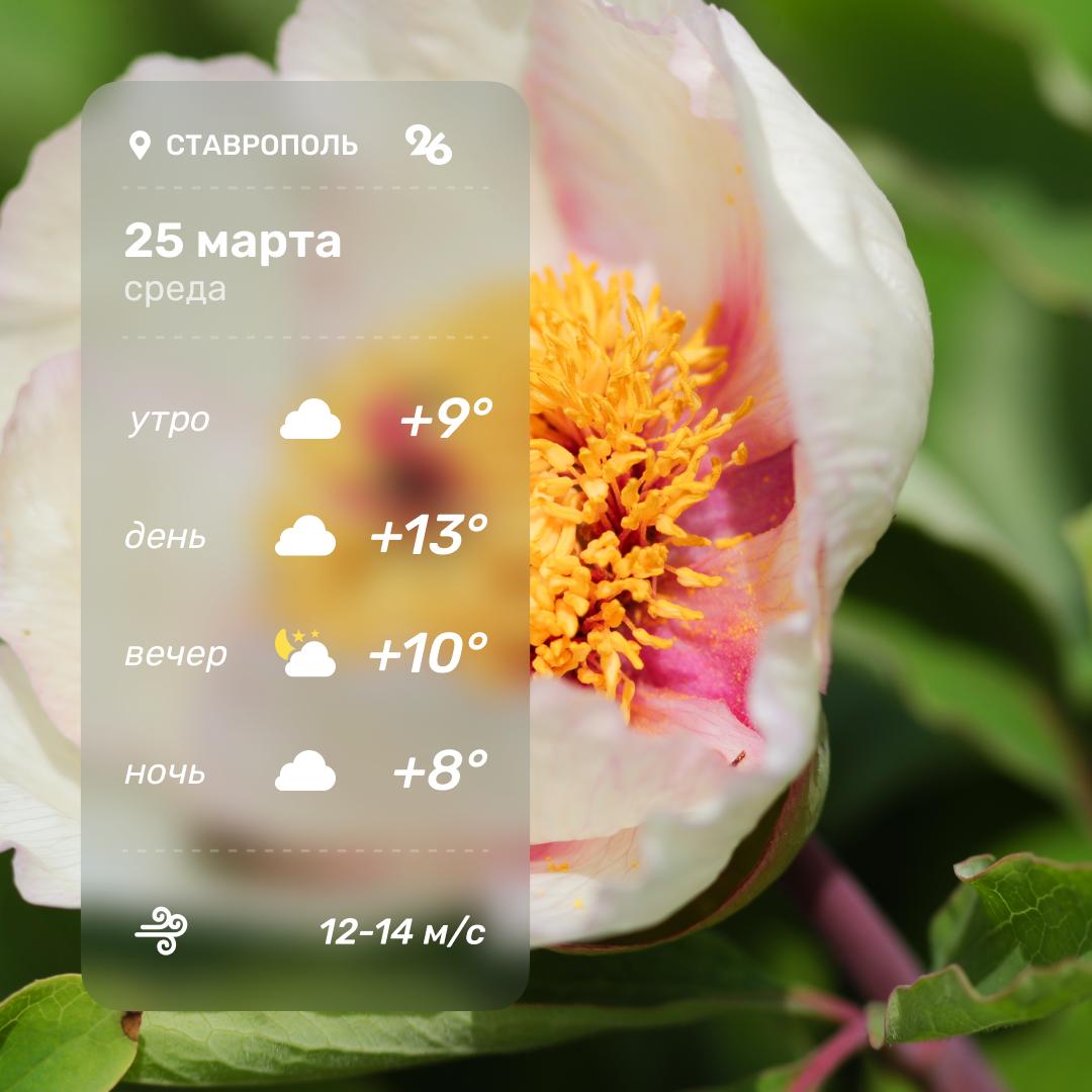 Ветер восточный 6-11 м/с, порывы 12-14 м/с. В среду, 25 марта, температура воздуха по краю ночью +4...+9°, днём +12...+17°.В Ставрополе без существенных осадков, утром туман...
