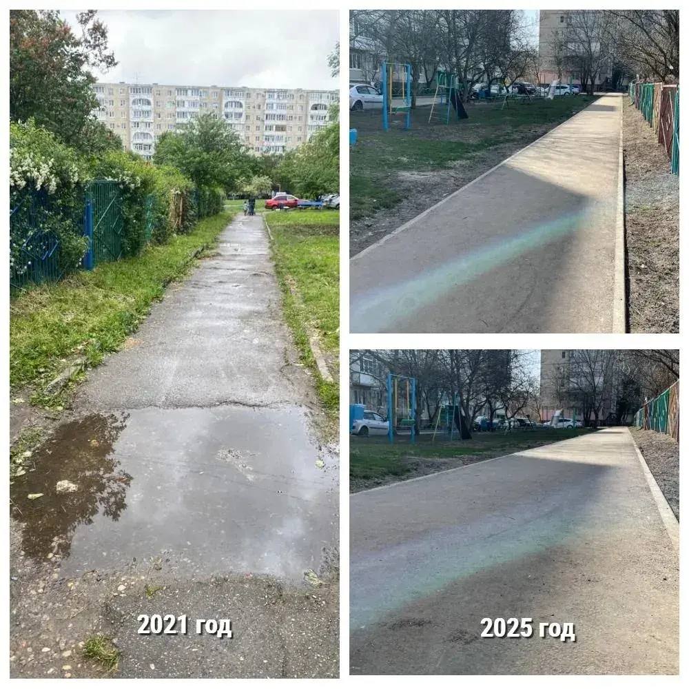 Также отремонтирована тротуарная дорожка по адресу проспект Юности, 17. Теперь родителям с детьми стало удобно и безопасно подходить к детскому саду № 78.