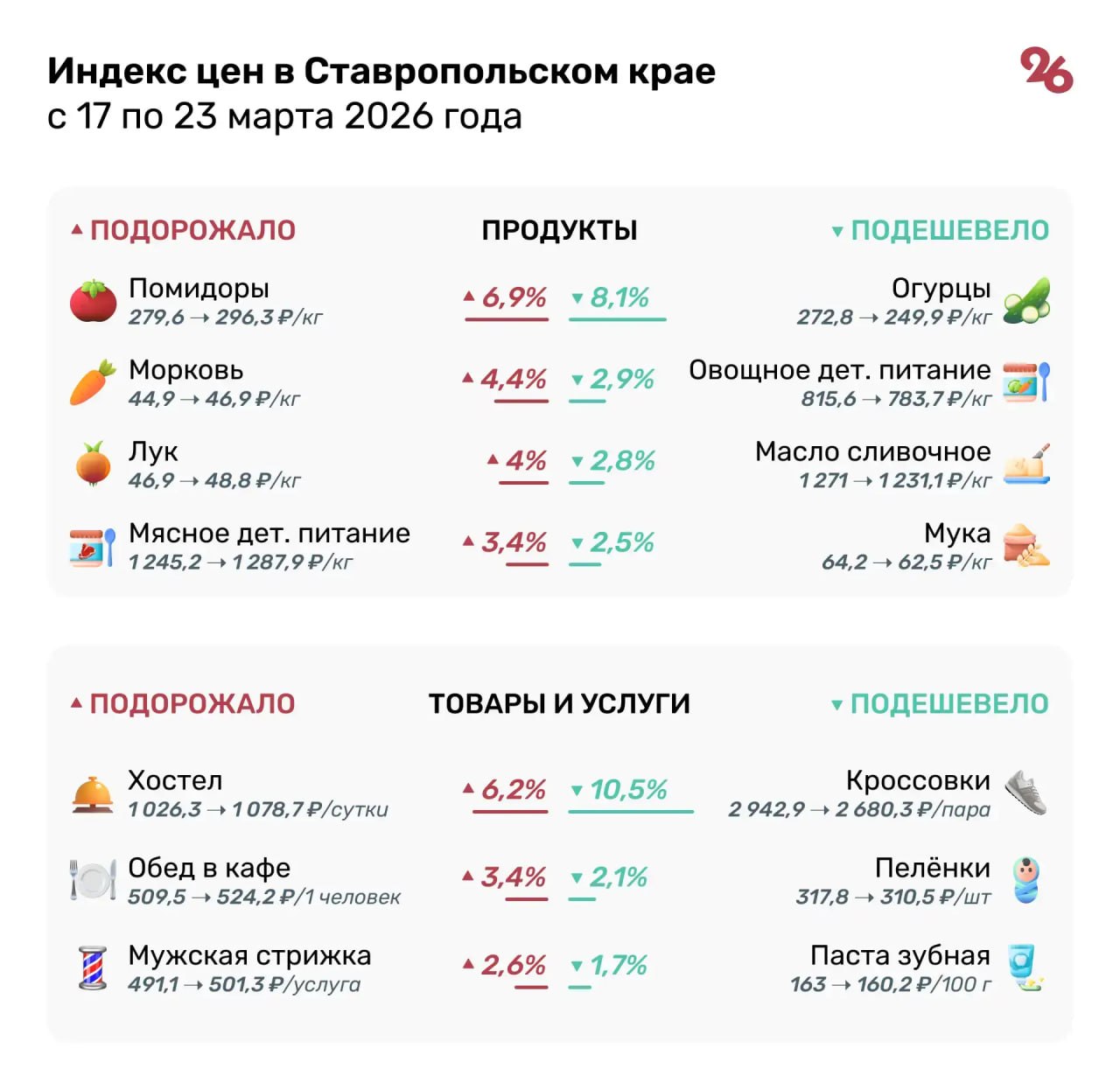 Зато подорожали помидоры, лук и морковь, сообщает Северо-Кавказстат по данным еженедельного мониторинга цен. Подробнее о ситуации с ценниками на продовольственные товары и услуги в крае – в нашей инфографике.