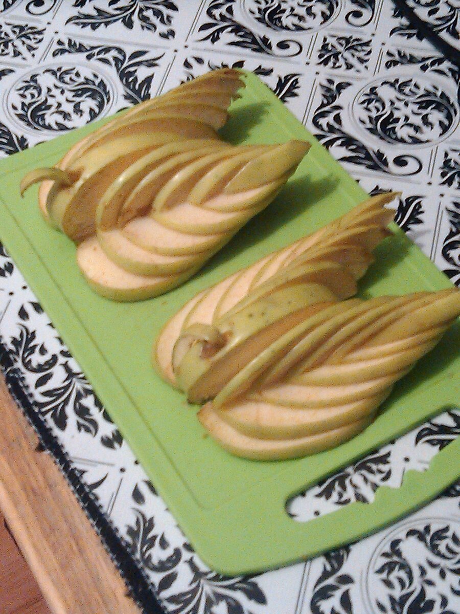Для предотвращения потемнения яблока, смешать лимонный сок с водой.Каждую часть, предназначенную для создания лебедя, окунуть в воду с лимонным соком.Помыть яблоко и разделить его на две половинки.Срезать часть яблока под углом, чтобы одна половина стала «телом» лебедя.Поставить эту часть на срез, визуально разделив на три области: два крыла и спина. Крылья формировать из дольков.Из дольки «крыла» отрезать меньшую дольку, отступив примерно на 5 мм.Из полученных частей формировать крыло, смещая дольки друг относительно друга.Похожим образом создать второе крыло и «оперение» на спине.Из оставшейся части яблока вырезать голову лебедя. Гвоздиками сделать глаза.На спине сделать вырез, чтобы крепить голову.