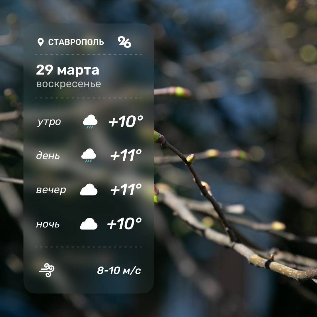 Ветер северный 5-10 м/с. В воскресенье, 29 марта, температура воздуха по краю ночью +6...+11°, днём +12...+17°.В Ставрополе небольшой дождь, утром туман...