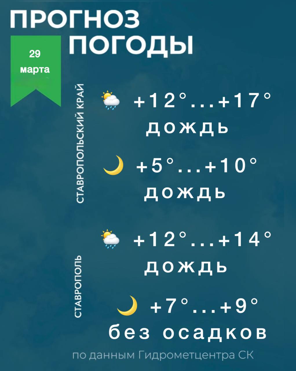 Ветер северный 5-10 м/с. В воскресенье, 29 марта, температура воздуха по краю ночью +6...+11°, днём +12...+17°.В Ставрополе небольшой дождь, утром туман...