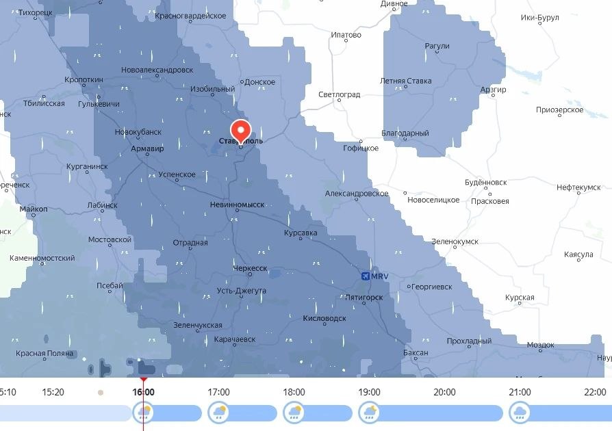 По прогнозу, осадки в Ставрополе начнутся в 16:00 и закончатся не раньше завтрашнего утра.