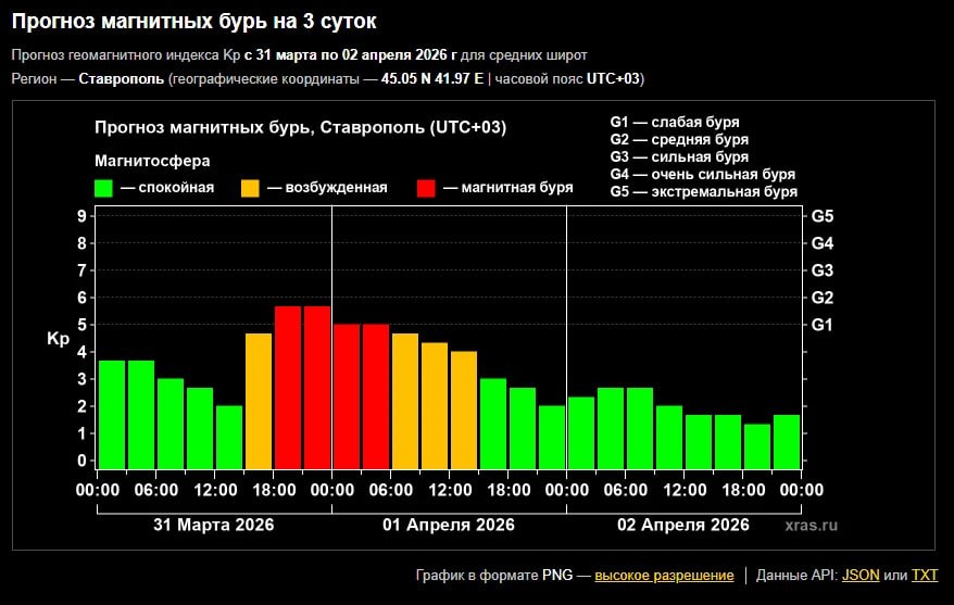 Она начнется уже сегодня в 18:00 и практически достигнет уровня G2. После полуночи колебания немного ослабнут, но полностью прекратятся лишь к 12:00 1 апреля.