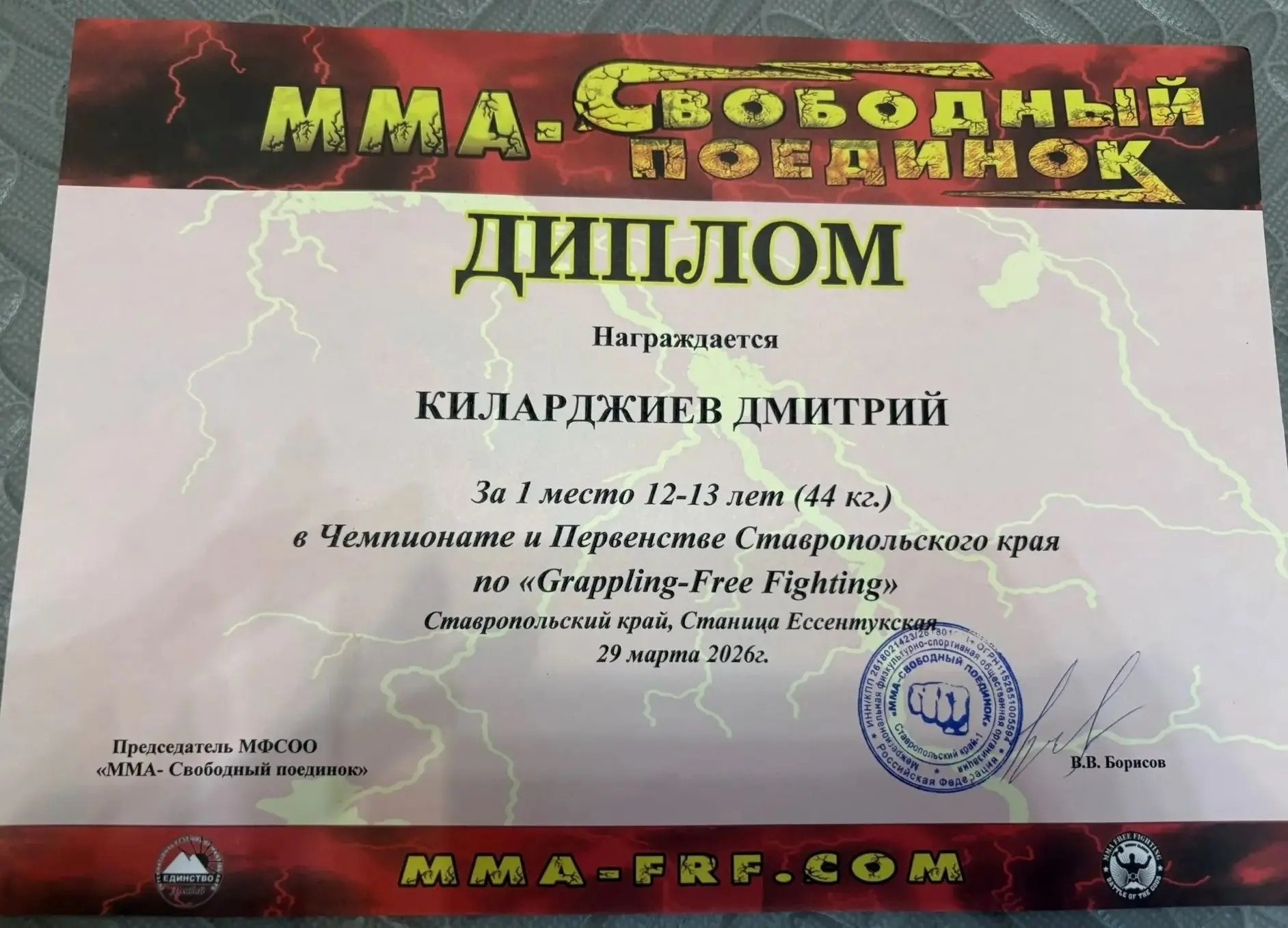 Дмитрий стал победителем чемпионата Ставропольского края по «GrapplingFree Fighting», который прошёл 29 марта 2026 года в станице Ессентукской под эгидой МФСОО «ММА - свободный поединок».