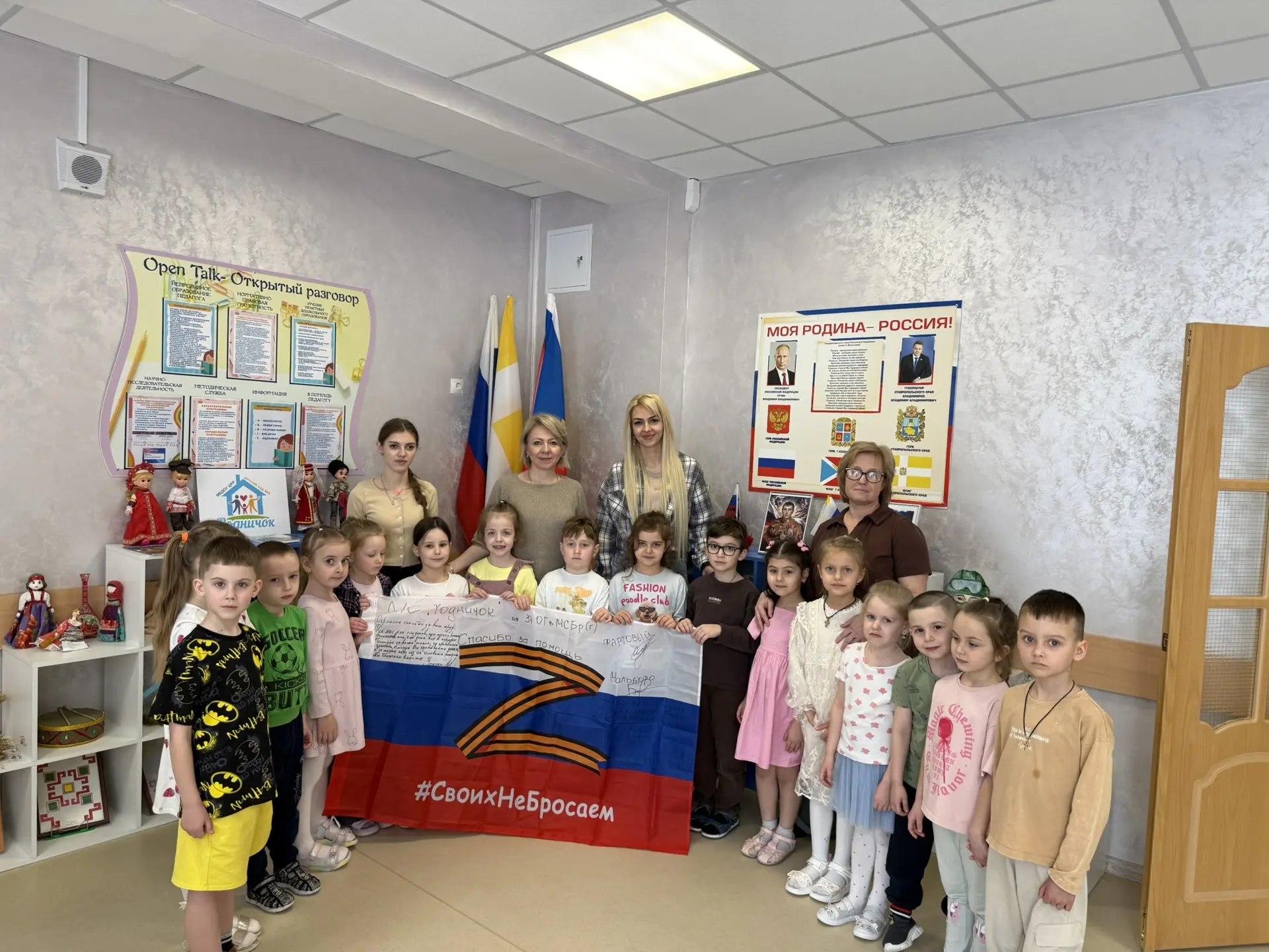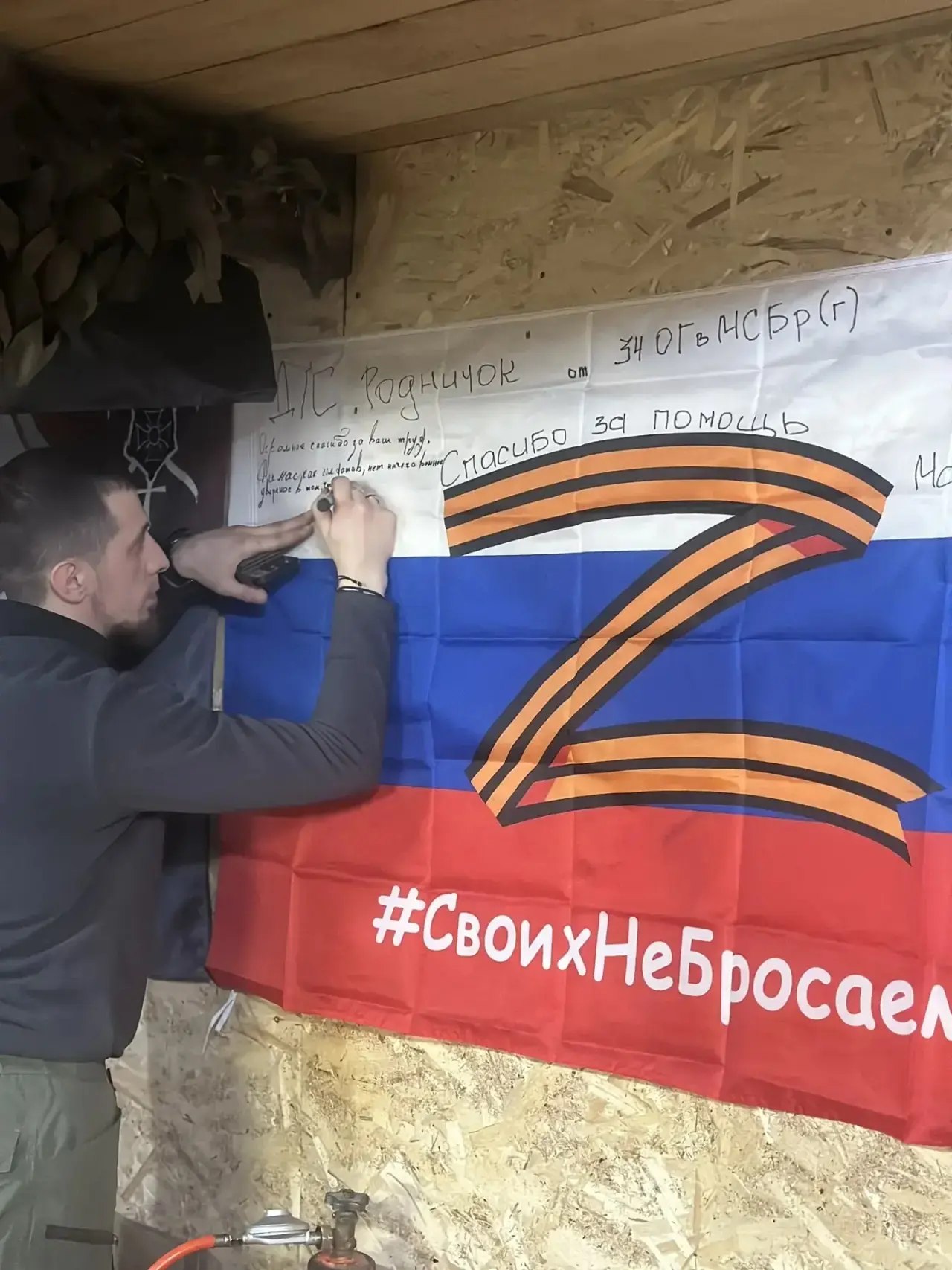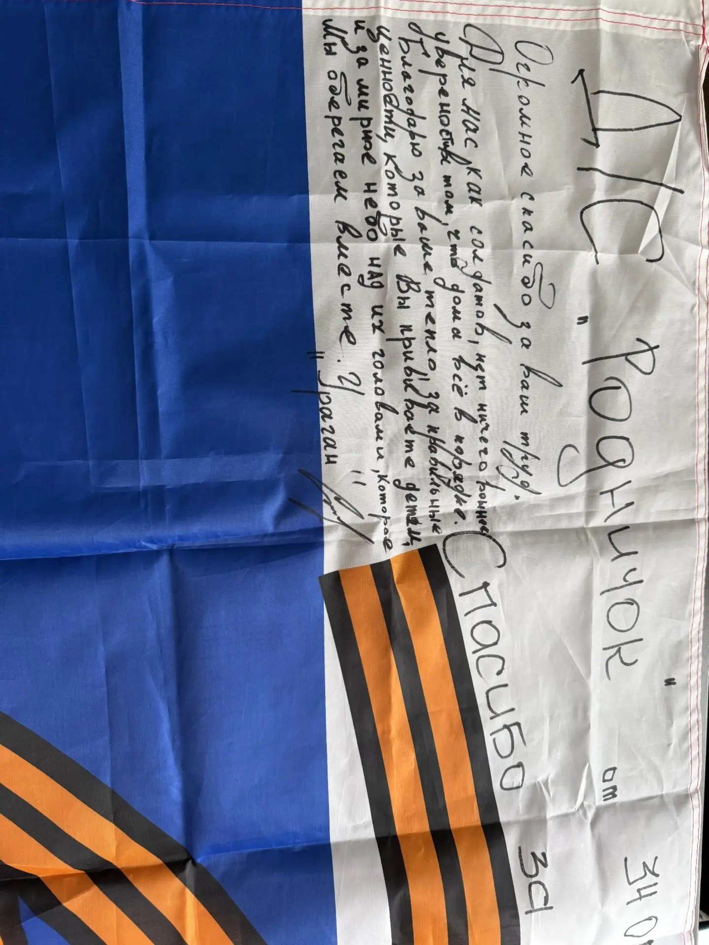 Бойцы 34 ОГ в МСБр(г) поблагодарили МБДОУ ЦРР детский сад №9 «Родничок», за активную помощь и поддержку. Это замечательный и глубокий жест. Очень символично, что слова благодарности написаны именно на флаге страны.