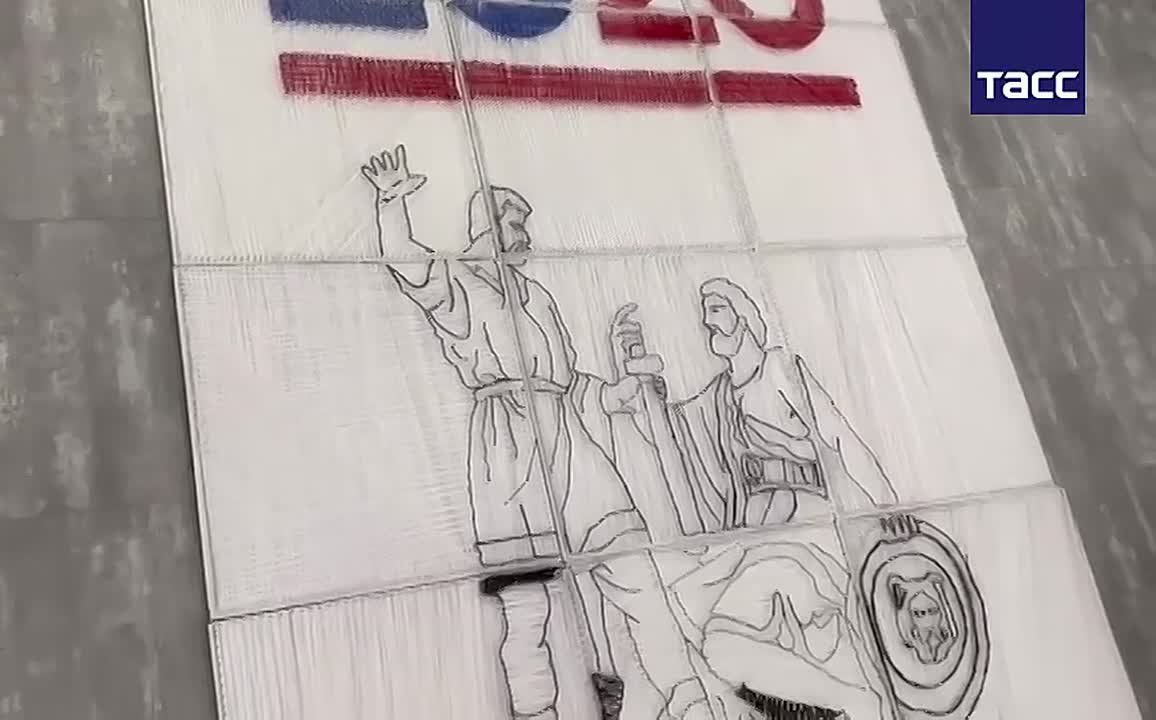 На конструкции изобразили Кузьму Минина и Дмитрия Пожарского, а также надпись "Год единства народов России". Участники программы использовали нити цветов флага России.