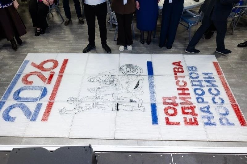 Картина собрана из тысяч гвоздей и нитей в цветах российского флага. В ее основе - образы Кузьмы Минина и Дмитрия Пожарского, а также надпись «Год народов России».