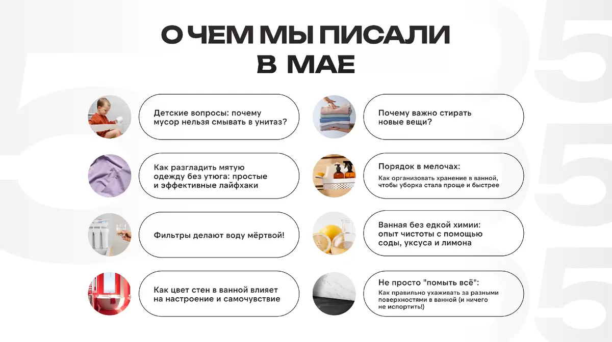 В мае CHARUS предложил своим читателям несколько увлекательных и полезных статей, посвященных быту и домашнему уюту. Рассмотрены важные аспекты, такие как: почему нельзя смывать мусор в туалет, как очистить ванну без химических средств и значение стирки новых вещей перед ноской.