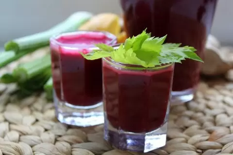 Все, что требуется для этого насыщенного сока, – это помыть и очистить свеклу, морковь, сельдерей и имбирь, а также апельсин и лимон. Нарезать все ингредиенты на небольшие кусочки. За основу берется сок из апельсина и лимона, после чего очередь приходит к сельдерею, имбирю, свекле и, наконец, моркови.