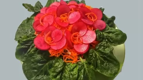 Попробуйте добавить к салату красивые элементы в виде цветов из редиски и шпината, чтобы создать поистине праздничное настроение!
