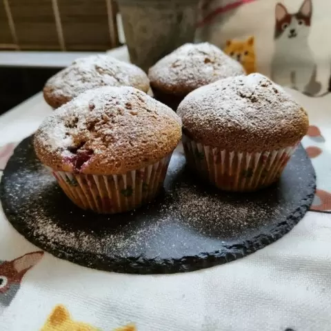 Разложите тесто по формочкам: в каждую следует положить по полной столовой ложке с горкой, а затем равномерно распределить оставшееся тесто. Выпекайте маффины около 30 минут. Готовность проверьте при помощи сухой спички – она должна выйти чистой. Когда маффины остынут, посыпьте их сахарной пудрой для красивой подачи.
