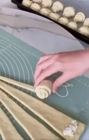 В широкую часть каждого треугольника положить немного сырной начинки и свернуть в рулет, как круассан.