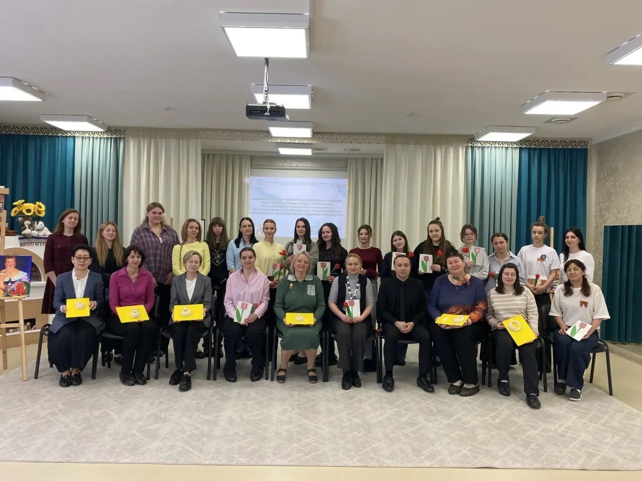 В рамках муниципальной опорной площадки по наставничеству педагоги детского сада показали иммерсивное путешествие по России - инновационную технологию приобщения к традиционным ценностям. Участники узнали об истории муромского калача и увидели красоту тюльпанов Калмыкии.