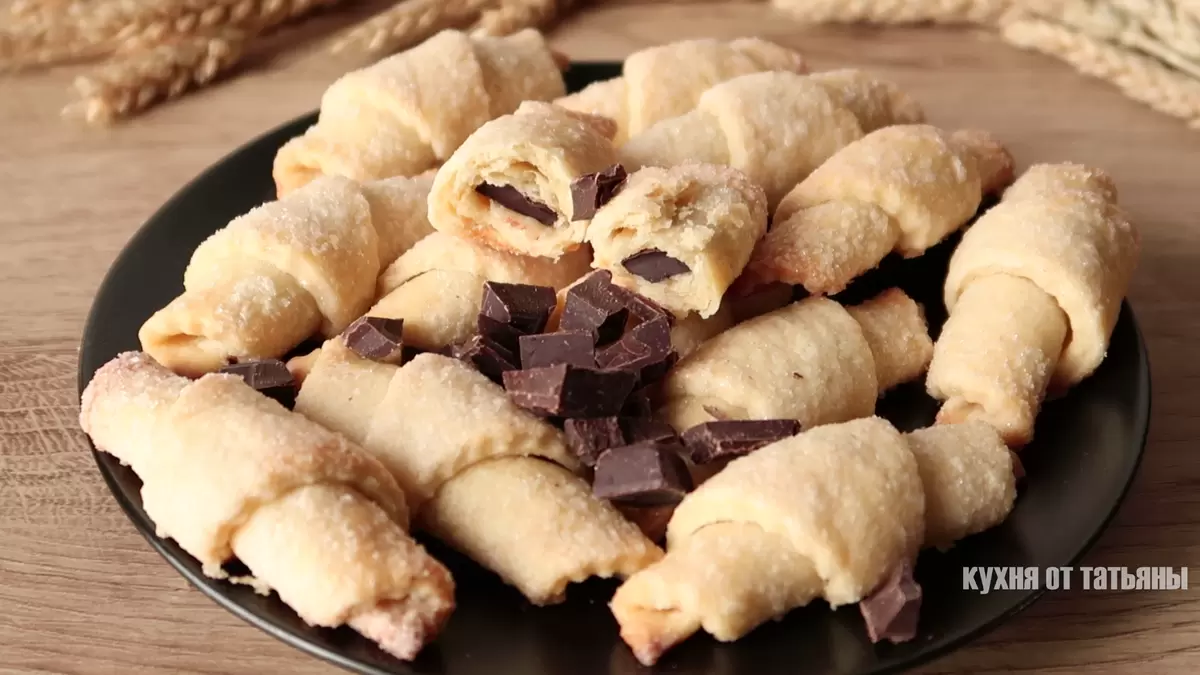 Замесив тесто, его делят на четыре равные части, и каждая раскатывается в круг толщиной 2-3 мм. Затем этот круг нарезают на восемь треугольников. В каждую из них укладывают кусочек шоколада и сворачивают в трубочки. Перед выпечкой рогалики обмакивают в сахар и помещают на противень, лучше сделать это хвостиками вниз, чтобы они не развернулись во время готовки.