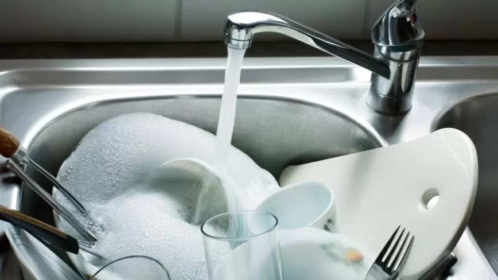 - Подготовка к мытью: Удалите остатки пищи, а затем наполните раковину теплой или горячей водой с небольшим количеством моющего средства. Альтернативно можно использовать тазик для мытья менее грязной посуды сначала.