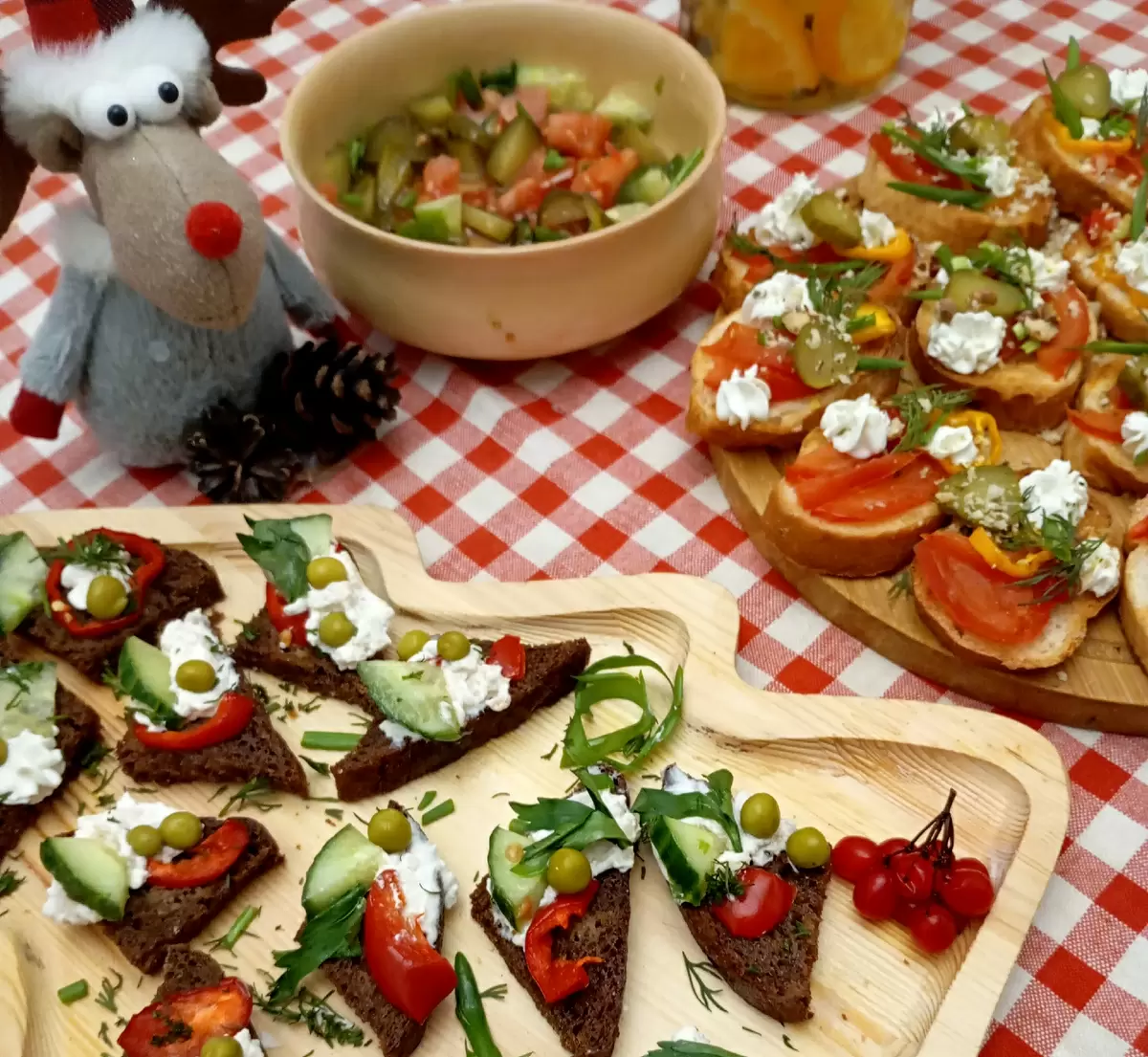 Не менее интересным будет вариант с бородинским хлебом. Его нарезают на треугольники, подсушивают и намазывают фиш-кремом с кальмарами и креветками. Для красоты можно добавить дольки свежего огурца, болгарского перца и украсить зеленью. Шпажки с консервированным горошком и веточками калины добавят изысканности вашим канапе.