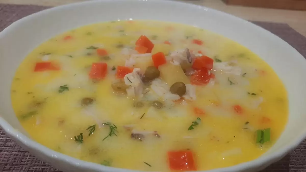 Готовые овощи разместите в супе, а затем добавьте заранее нарезанный плавленый сырок, чтобы он хорошо растаял в горячей жидкости. В самом конце добавьте консервированный зеленый горошек, нарезанное куриное мясо и свежую зелень. Посолите и поперчите по вкусу, дайте настояться 5-7 минут.