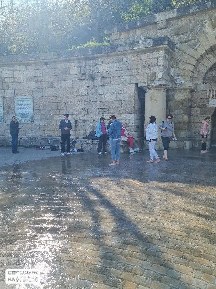Необычное зрелище не отпугнуло отдыхающих: наоборот, многие снимают обувь и с удовольствием гуляют босиком по воде.