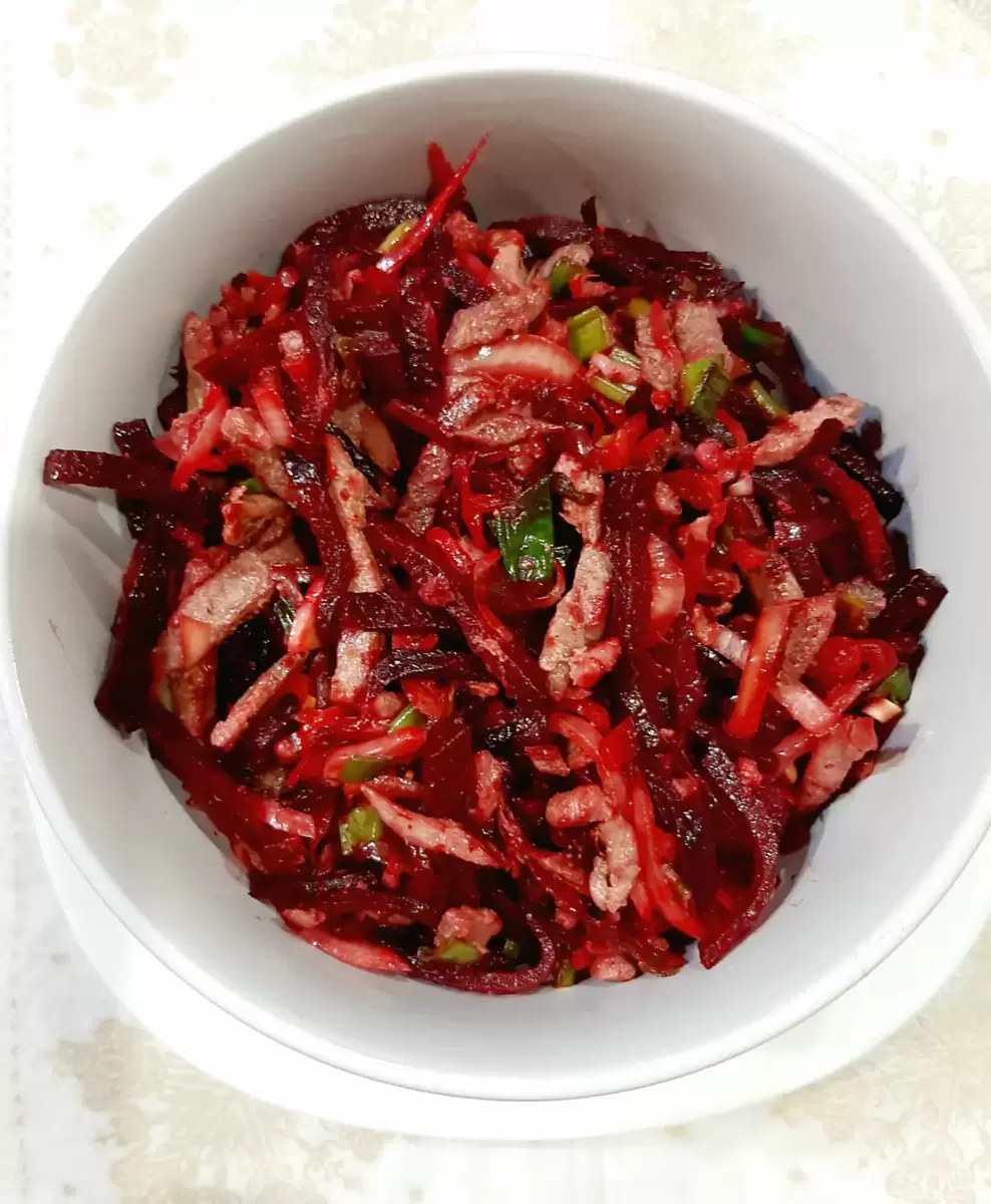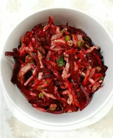- Салат с пекинской капустой: отварная свекла, пекинская капуста, репчатый лук, свежая зелень и морковь по-корейски. Все ингредиенты следует нарезать и заправить растительным маслом.