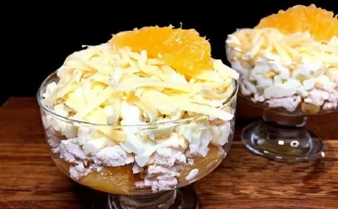 Каждый из ингредиентов добавляет свою нотку: курица придаёт сытность, орехи — хруст и тепло, сыр — нежность, а апельсин с кисло-сладким вкусом делает блюдо по-настоящему праздничным.