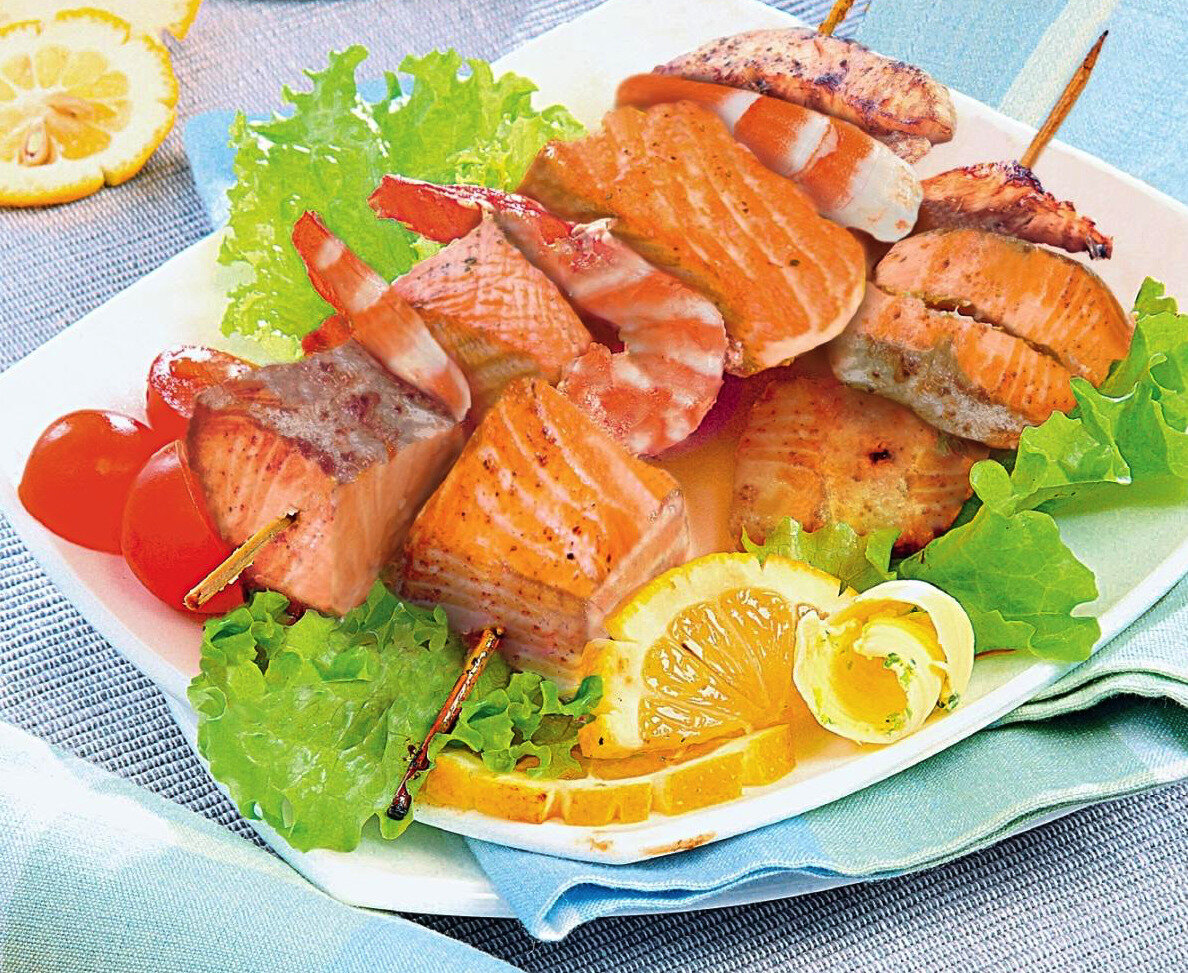 Приготовить шашлык очень просто: нарежьте рыбу и креветки, маринуйте их с лимонным соком и специями, а затем запекайте на гриле, периодически сбрызгивая глазурью из меда и лимона.