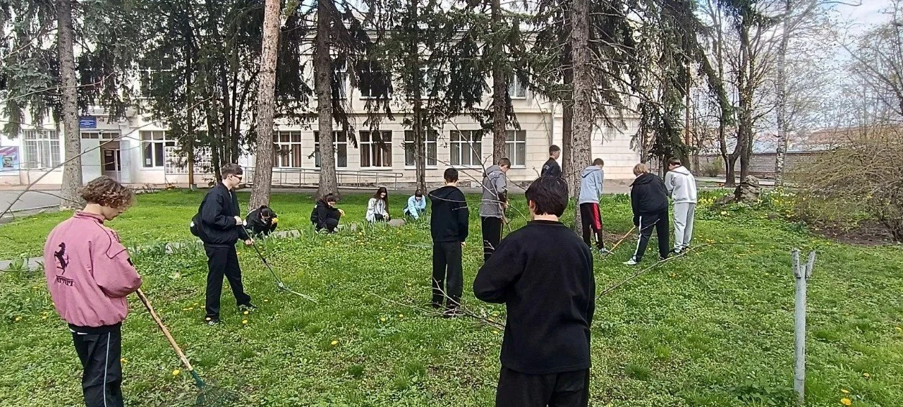 Во время субботника ребята с граблями и тяпками навели порядок во дворе: убрали сухие листья и ветки.