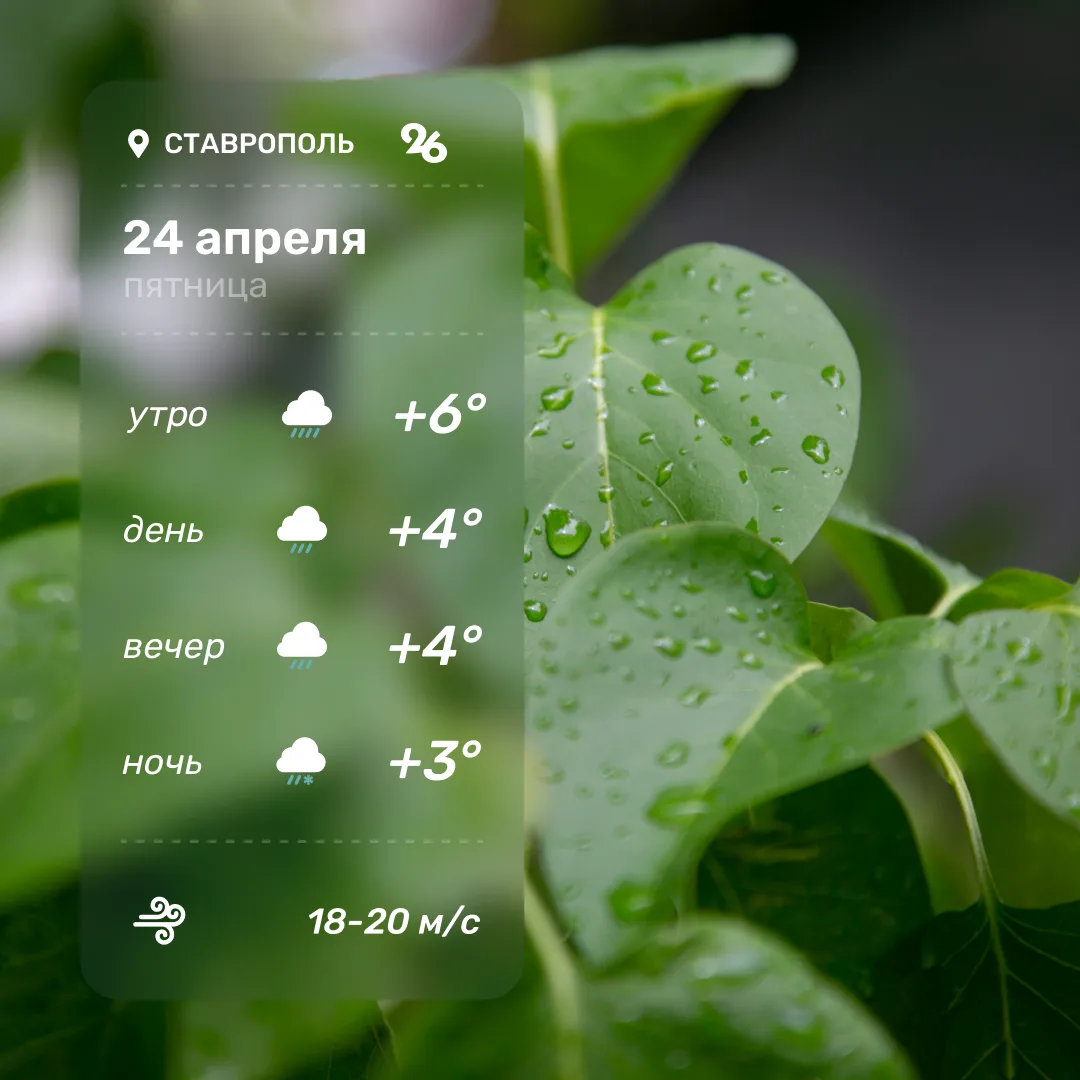 Ветер западный 6-11, порывы 15-20 м/с. В пятницу, 24 апреля, температура воздуха по краю ночью -3...+5°, днём +9...+14°.В Ставрополе дождь, днём +9...+11°.
