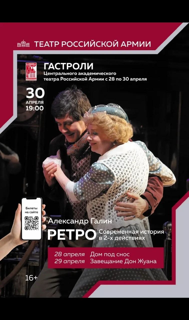 30 апреля —трогательный спектакль «Ретро». И вновь на сцене "Золотой" состав труппы. Народные артисты России: Алина Покровская, Артем Каминский и заслуженный артист России Сергей Колесников.