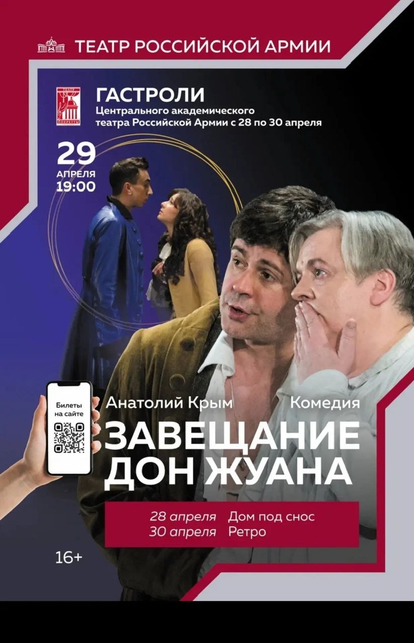 29 апреля –нас ждёт встреча с комедией «Завещание Дон Жуана». Здесь будут блистать: народный артист России Артем Каминский и заслуженный артист России Константин Денискин.