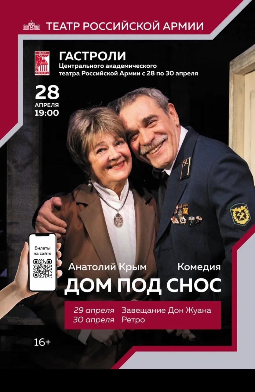 28 апреля гастроли откроет спектакль «Дом под снос» с "звездным" дуэтом – народной артисткой РСФСР Алиной Покровской и заслуженным артистом России Сергеем Колесниковым.