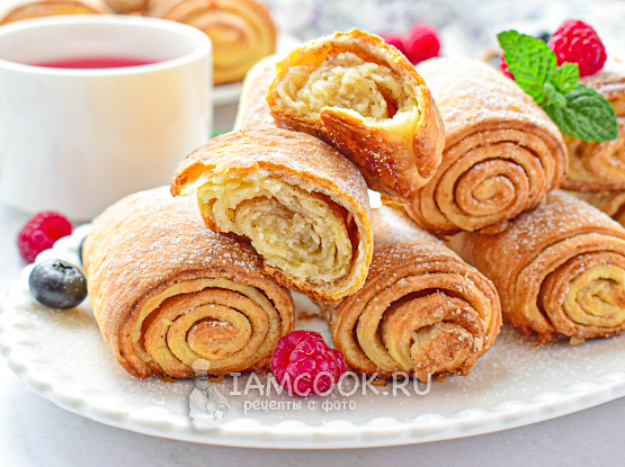 - Приготовление: Соединить творог с сахаром, добавить яйцо и перемешать. Затем вмешать размягченное масло и, постепенно добавляя просеянную муку с содой, замесить тесто. Оно должно быть мягким, но не липким. После этого раскатать тесто, посыпать сахаром с корицей, нарезать полосками и свернуть в рулетики.