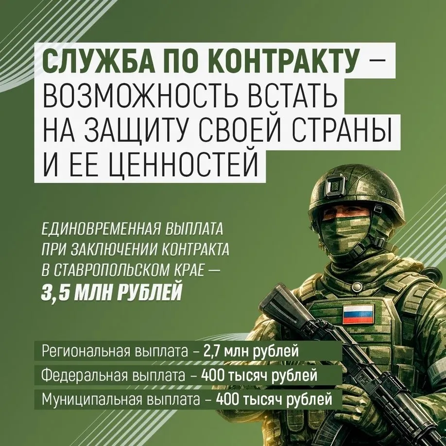 Военнослужащие, заключившие контракт в Ставропольском крае, имеют шанс стать частью сплоченной команды и получить единовременную выплату в размере 3,5 млн рублей.