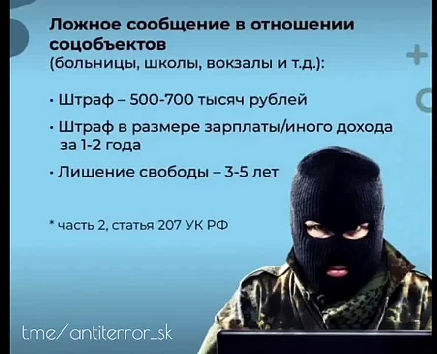Аппарат антитеррористической комиссии Ставропольского края информирует, что заведомо ложное сообщение об акте терроризма является преступлением, предусмотренным статьей 207 УК РФ.